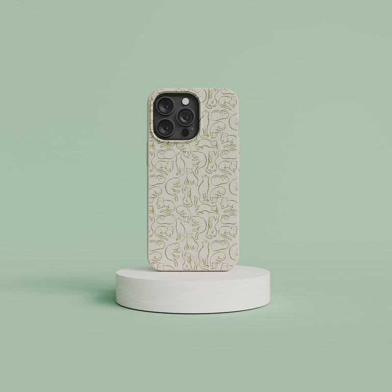 Calling all cat enthusiasts! The Say Meow Phone Case is here to whisker you away to a world of feline fun. Adorned with an enchanting pattern of minimalist cat sketches in serene green on a calming London Fog background, this case is the purr-fect blend of chic and playful. The Say Meow Phone Case not only showcases your love for cats but also for the planet. Meow's the time to add a touch of kitty charm to your daily routine! 😺📱