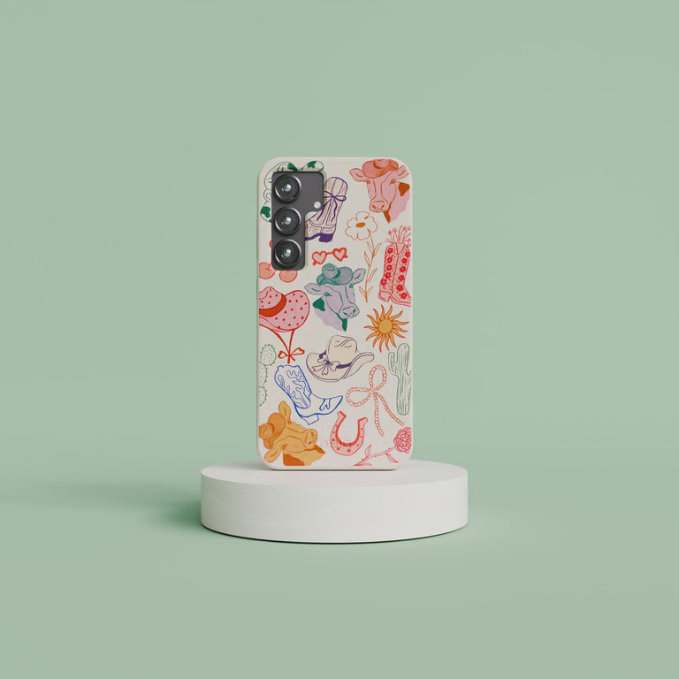Yeehaw, but make it vintage! Retro Rodeo Phone Case is a wild mix of western flair and throwback charm, featuring doodled cowboy boots, hats, cacti, sunbursts, cherries, and some seriously stylish cows. Whether you’re two-stepping at a honky-tonk or just adding a little country cool to your everyday, this case brings bold colors and rodeo-ready vibes straight to your phone.🌵🌞